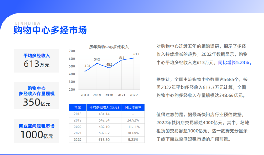 邻汇吧连续六年调研全国购物中心多经收入,见证平均多经收入从434万元增至613万元;2024年,全国各类商业综合体及购物中心存量规模超过6000座,预估多经收入存量规模超350亿元。