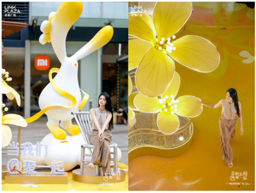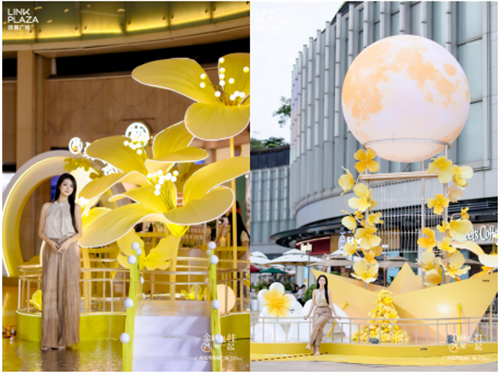作为周年庆亮点之一,广州荔湾领展广场打造广佛首个「金秋赴桂」桂花主题香气限定展。现场美陈以超过150㎡的空间还原金秋月圆赏桂之景,空中悬挂超8米高巨型圆月装置,结合原创IP「富桂兔」系列形象,融入桂花香氛,构建 MULTISENSORY沉浸式文旅打卡空间。该美陈在线上更被以「金秋人间富贵花」为传播概念,迅速在小红书等平台引发打卡热潮,成为国庆期间家庭及年轻客群的热门目的地。