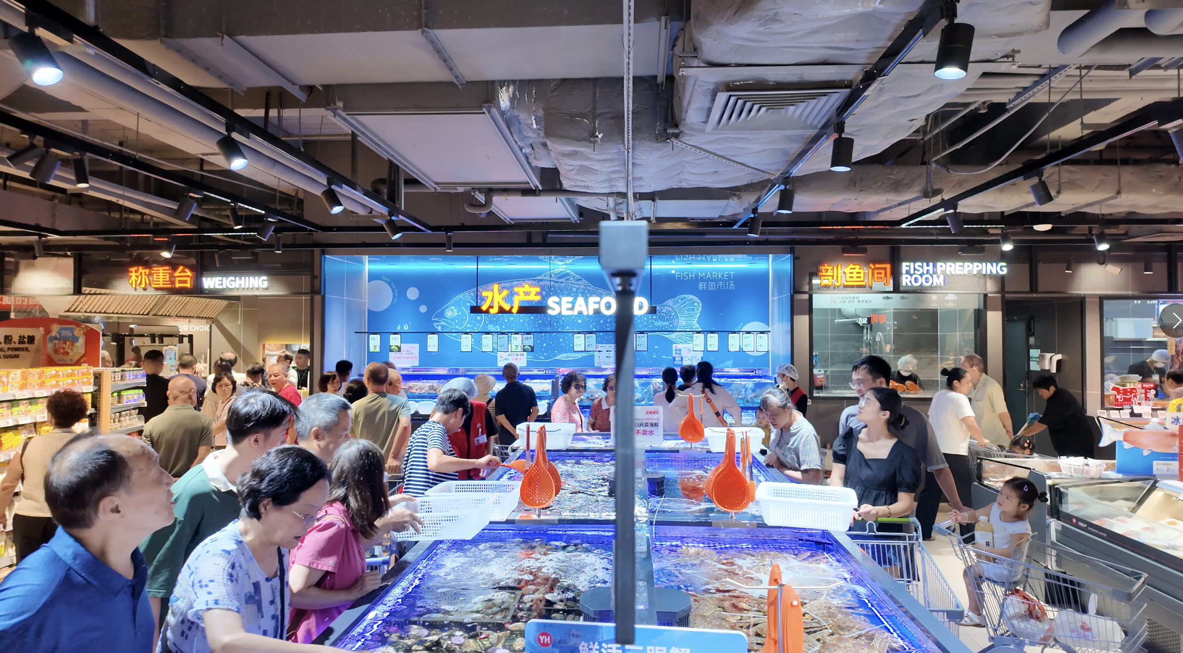 服务细节方面同样全面升级。两家店的肉禽柜台均可提供切丝、切片、绞肉、剥皮等个性化加工;广州荔湾领展广场店的高端海鲜区更提供清洗、打氧服务,并可现场进行清蒸、蒜蓉等简单烹饪。调味品货架旁设放大镜,连卷袋区配湿手器,散装食品标注每斤约含数量,果切组合按甜度标明食用顺序,从细微处提升购物体验。