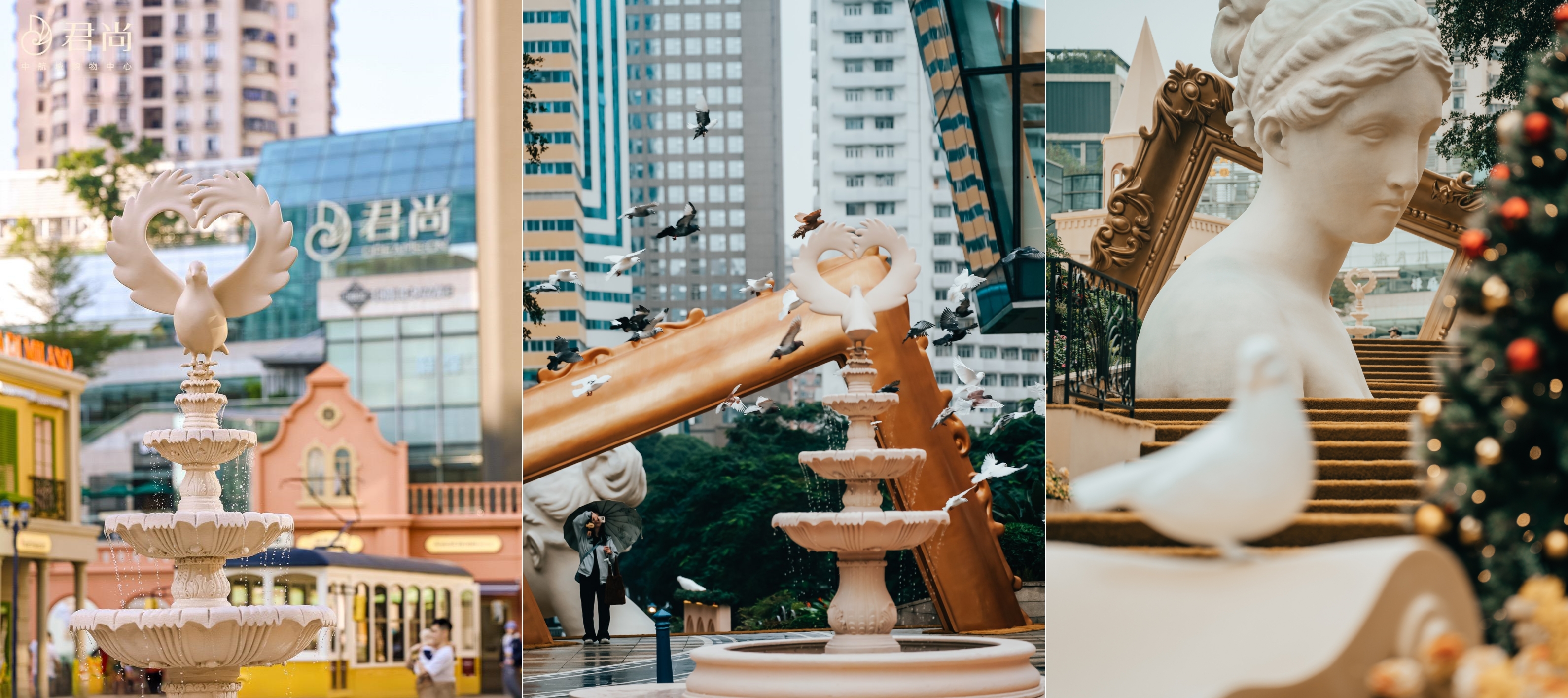 “假日70帧”以“文艺浪漫复兴”为内核,巧妙联结东方都市与欧陆古典情调。创意灵感跨越地理边界——从深圳街头悠然栖息的鸽子,到米兰广场上翩然起落的鸽群,二者同样象征着城市中自由、优雅的生命力。街区以此为情感线索,融汇米兰布雷拉美术学院的艺术气息、大教堂的恢弘轮廓与斯福尔扎城堡的典雅线条,在现代化商圈的肌理中,构筑出一座穿越时空的“步行式古典城邦”。
