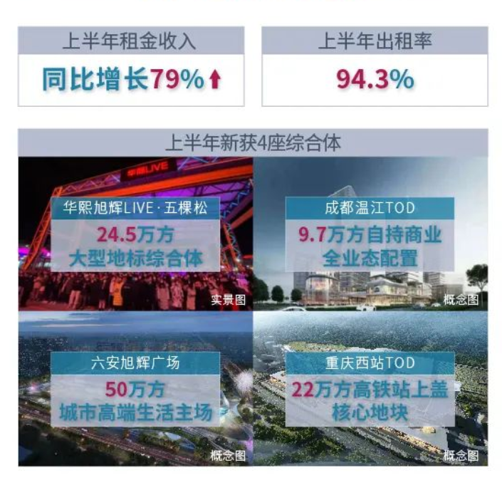 报告期内,旭辉持有物业运营总收入为5.17亿元,持有物业租金收入为3.91亿元,同比增长79%,出租率保持在94.3%。目前,在营商业项目9座,在营总建筑面积63万平方米。 上半年,旭辉新获取四座综合体,分别是:华熙旭辉LIVE·五棵松、成都温江TOD、六安旭辉广场、重庆西站TOD,还合计储蓄30余座商业综合体。
