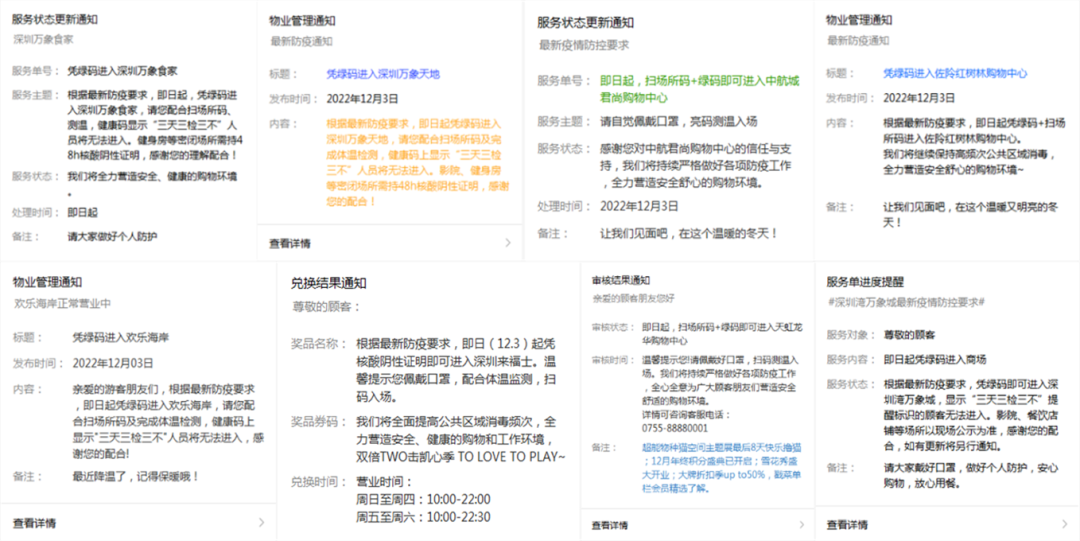 此外,深圳多商场发布服务状态更新通知:根据最新防疫要求,即日起,凭绿码进入,健康码显示“三天三检三不”的人无法进入。影院、健身房等场所以现场公示为准。