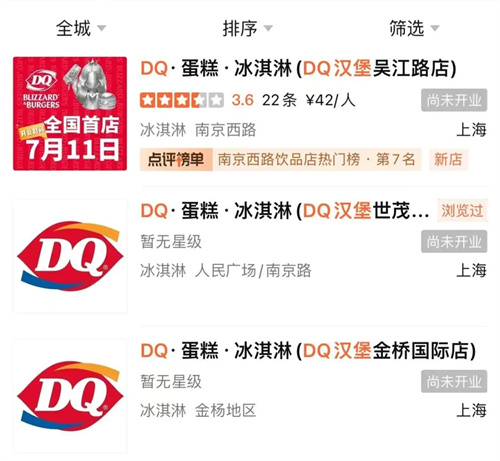 查询到,大众点评网显示DQ汉堡已布局世贸广场店、金桥国际店。