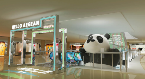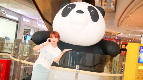 因项目最早期的空间条件关系,地下一层虽有很大的游逛区域,但进入街区的入口就只有简单的扶梯,“别有洞天”的购物空间如何能引得消费者关注?项目关注到“萌宠经济”早已成为情绪价值的风口之一,便将萌趣横生的熊猫形象引入空间,于是,一只巨型治愈的“HELLO PANDA”出现了。