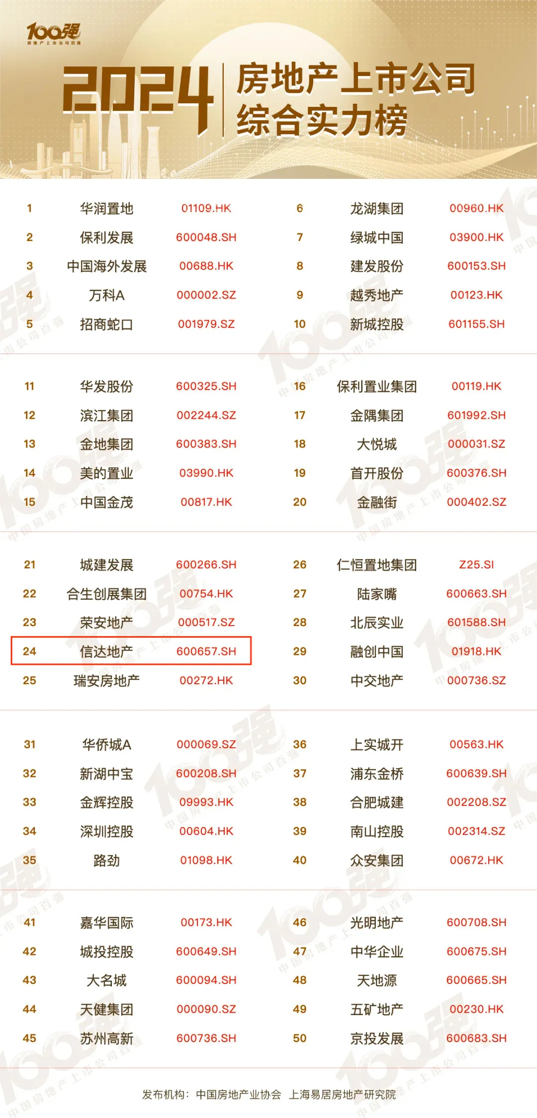 近日,由中国房地产业协会指导、上海易居房地产研究院主办的“2024房地产及物业服务上市公司测评成果发布会”成功举办。活动发布《2024房地产上市公司测评研究报告》,中国信达旗下信达地产(600657.SH)荣登“2024房地产上市公司综合实力榜”第24位。