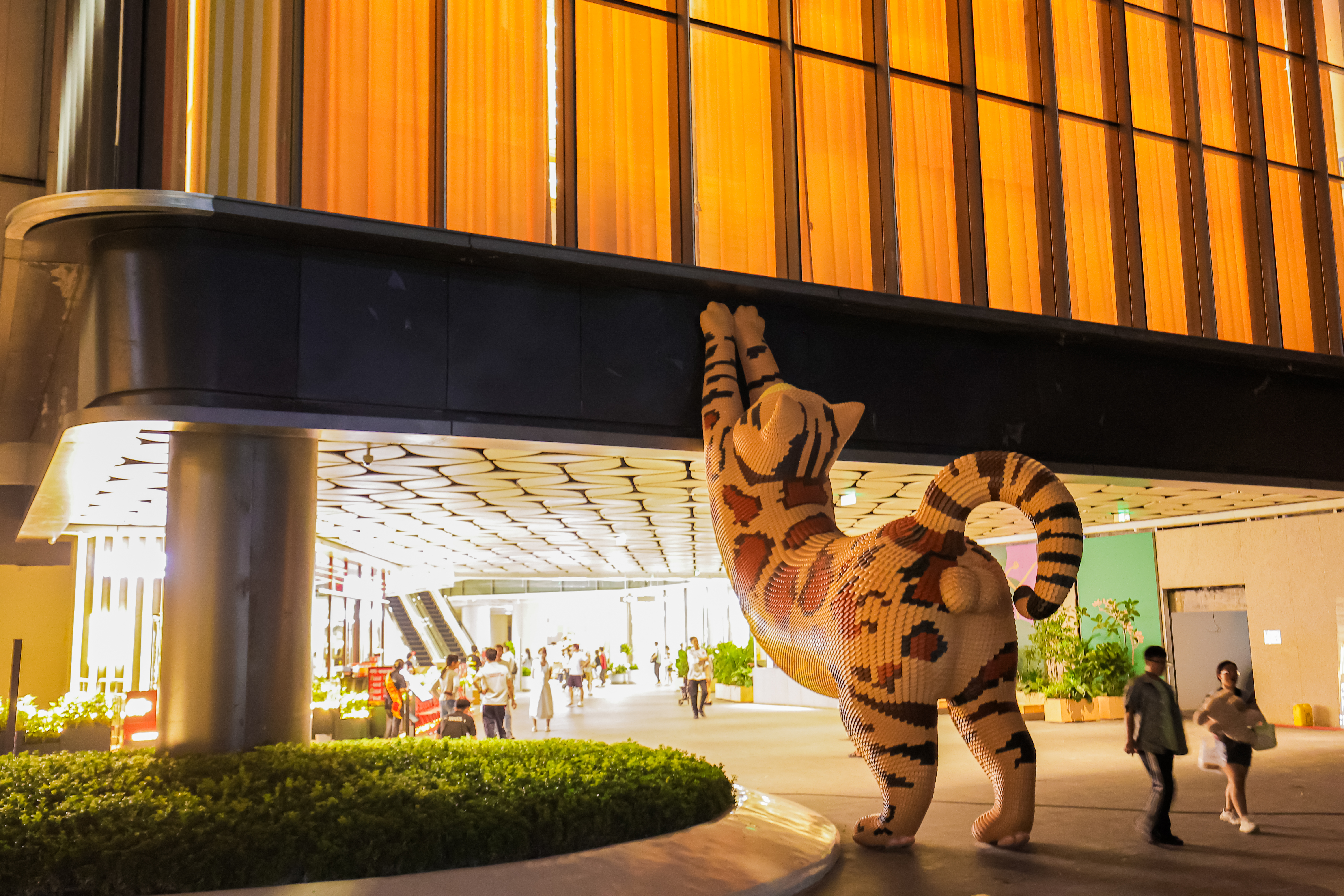 L2层户外架空平台的“然趣空间”是一个极具休闲性的宠物社交空间,项目积极践行可持续发展理念,利用废弃瓶盖搭建出了一个6米高的豹猫雕塑,并利用架空圆台打造宠物友好平台,设置了宠物便箱、宠物水源等多种服务设施。