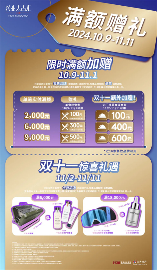 此外,针对10月金秋消费季及11月线下“双十一”,兴业太古汇另打造满额赠礼活动,推出限时加赠与惊喜礼遇双重福利。10月9日至11月1日期间,单笔实付满不同金额,在原有礼遇基础上,另可额外收获至高600元的无门槛美食现金券。11月2日至11日期间,会员单日消费达指定金额,则可兑换包括烧烤架、护肤品、滑雪镜等在内的多元好礼。