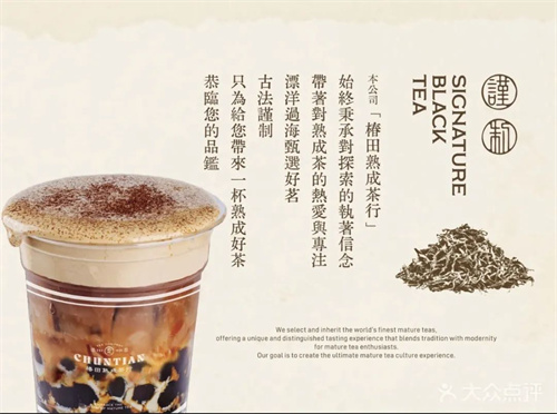 大众点评显示,椿田熟成茶行门店目前售卖包含独创黑武士熟成系列,熟成深焙鲜奶茶缇、黄油干酪云顶纯茶系列、熟成话梅水果茶、生酪云顶鲜奶茶系列、职人手作多料奶茶等,SKU高达23个,单价在14-22元之间。