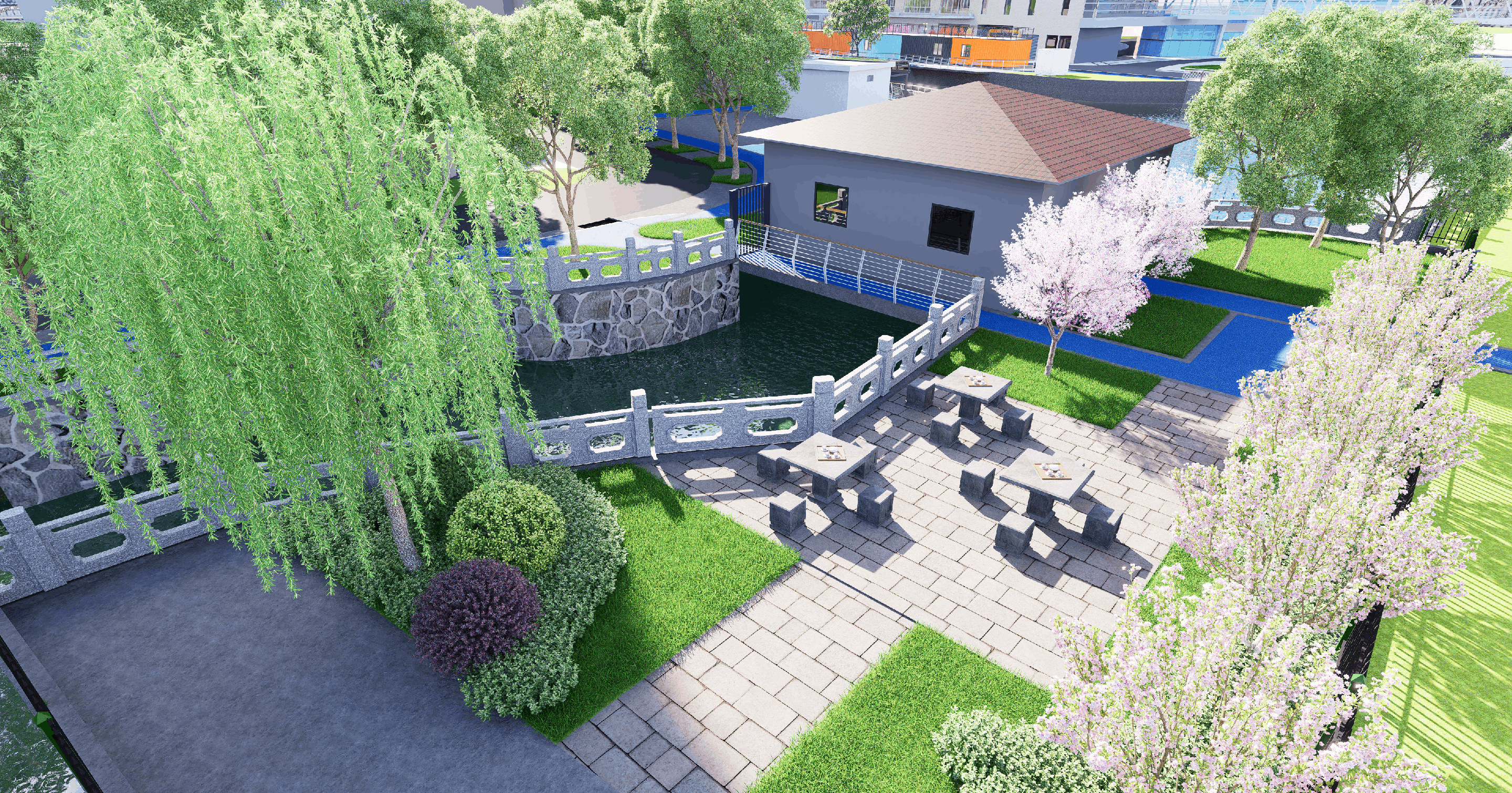沿河打造滨水步道,通过石材和木材的自然过渡与巧妙搭配,既保留了石材的稳重质感,又融入了木材的温润触感。两种高品质材料的交替运用,在确保实用性的同时,更营造出惬意放松的空间氛围。绿化带引入多种立体种植,选用季相变化明显的树种。夏季降温增湿,冬季保留常绿植物造景,实现“四季有景”的生态商业界面。