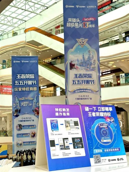 4月25日到5月5日,重庆星光时代广场作为王者荣耀五五开黑节首次开放的玩家特权商圈。全馆设置了5个NFC特权触发点,分别设置在4楼客服台、4楼华为智能生活馆、3楼霸王茶姬、6楼烤匠、B1层麦当劳门店。