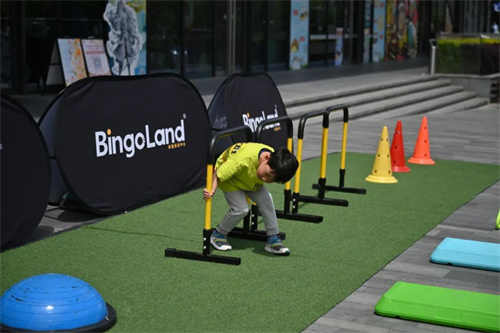 在老师的带领下,小朋友们调整姿势,穿过重重障碍,玩转障碍跳、平衡木、弹力球等趣味项目,享受着充满趣味与挑战的户外体能探险。BingoLand为活动增添了更多运动元素,让家长和孩子们在享受娱乐的同时,也能提升体能、激发运动兴趣。