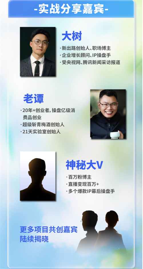 d.10+项目方(商业向善、身心疗愈、实体空间、科技AI)等,40+自由人才(互联网大厂人、IP操盘手、产品经理、合伙人)。