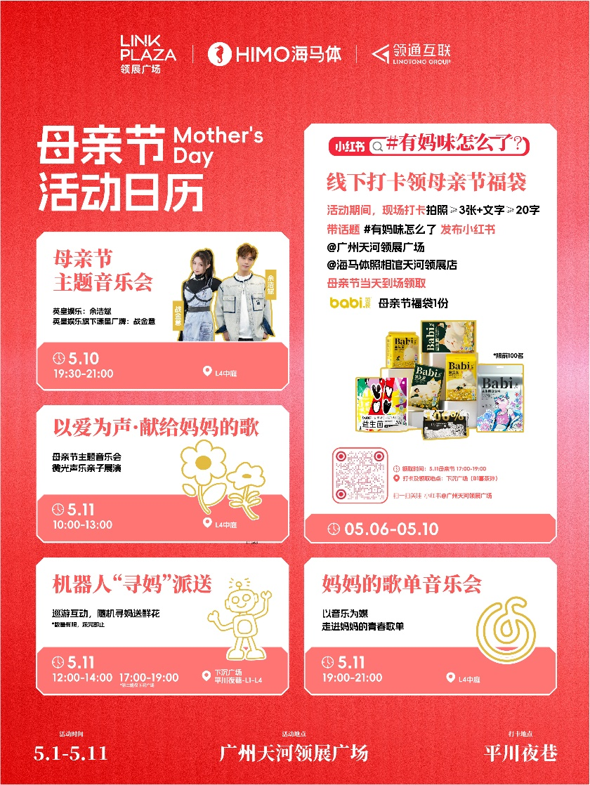 「妈味」上台进行时……母亲节的专属玩乐指南已出炉! 5月10日,母亲节主题音乐会邀你纵情尽享,听余浩斌、战金意用《爱得太迟》《世上只有》《陪你走过漫长岁月》等曲目解构港乐里的哲学;5月11日母亲节当日晚,邻家乐队带你在邓丽君、周杰伦的旋律中,重返各年代妈妈的青春站台,《分分钟需要你》、《情非得已》等更多熟悉旋律现场一齐揭秘。母亲节当日,天河领展广场还将与微光声乐一起献歌给妈妈,以爱为声,开启难忘的亲子时光,当日更有机器人带队闪现巡游,现场随机“寻妈”送鲜花糖果,社牛合影模式全开!