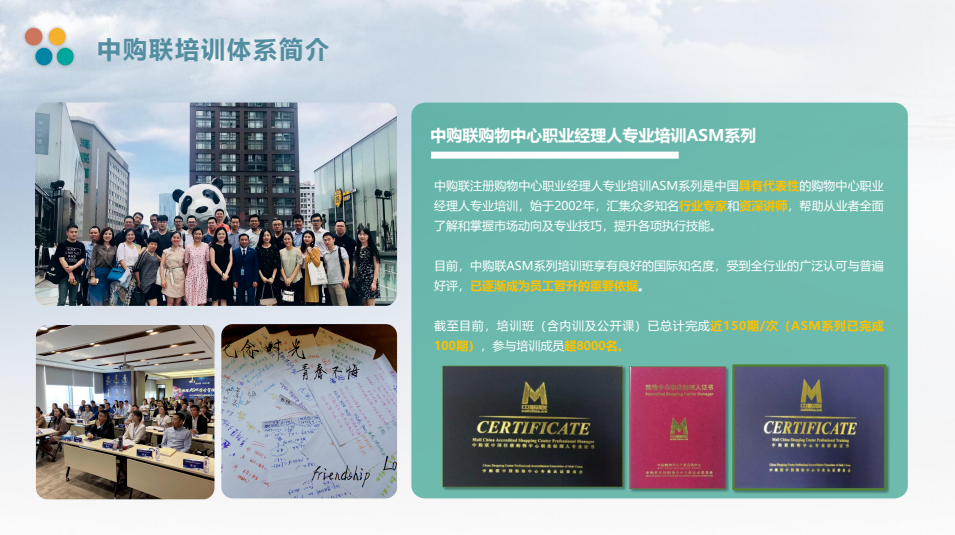 中购联通过不断对行业发展的摸索和趋势分析,有针对性地优化定制二十大核心主题和培训课纲,携手众多拥有实战经验的讲师团队,通过具有“实战性”“本土性”“专业性”等授课方式,曾多次为多个企业定制培训方案,如北京首都机场餐饮发展有限公司、华联集团、银座集团、绿地商业、王府井集团、大华集团、新城控股集团等主流企业,有效帮助在职员工改善和提高专业运营知识、招调技能、工作方法,也为企业发展培养了众多高水平人才。