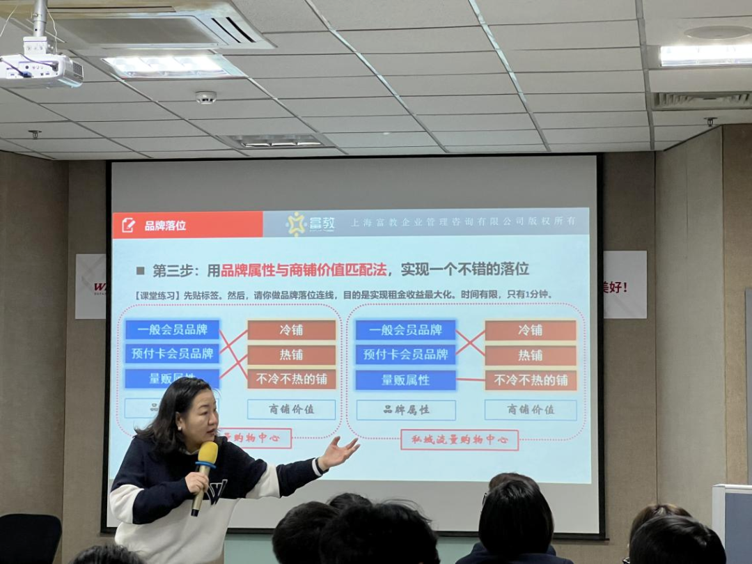 对购物中心而言,运营优化与升级调整是一个永恒不变的命题,与时俱进的升级是保持购物中心最佳经营业绩和持续竞争优势的重要措施。2023年购物中心新春开门红让不少行业从业者重新唤起新的希望,但依旧持观望态度,如何在新的一年拔得头筹、稳中求进就显得十分关键。为此,杜玉华老师以“深度运营,抢先复苏”的关键词回应学员需求,并从产品策略、资产策略两方面底层逻辑进行梳理讲授。从产品策略上说,购物中心依靠租户成功而成功,要优化运营需要平衡好MALL、租户、消费者之间的关系。如租户的角度来讲,租户运营的好坏,直接关系着购物中心盈利的多寡。经营的本质就是先帮租户赚钱,购物中心应该尽可能为租户提供良好的经营环境,并对租户的营销进行帮扶。从消费者的角度来看,多维度、多场景购物体验更能激发项目的可逛性特点,容易促进消费、增强复购率。而从资产运营策略来看,购物中心的核心力是资产运营,为此,老师为在场学员拆解了NOI以及租金的底层逻辑,并为大家答疑解惑。杜玉华老师表示,深谙购物中心深度运营的底层逻辑之后,可以此为原则指导购物中心招商工作,并建议可从市场调研、SWOT分析、业态品牌调改等多方面入手。她指出,充分的市场调研是首要的基础性功课。购物中心的招商运营人员应该对所在地区的经济状况、商圈客群、竞争对手、项目资产、管理、经营状况等基本信息全方位调研,知己知彼方能百战不殆。与此同时,招商运营人员也要对项目进行SWOT分析,对项目定位做出准确判断,发现自己优劣势,同时做好租赁决策和市场租金测算。通过引入契合项目特色的商业品牌、打造个性化消费场景和体验空间,形成差异化竞争优势,提升项目知名度、增强可逛性、提升销售额。课程现场,杜玉华老师就威高广场项目稳场、旺场的核心诉求,深度分析了品牌调改方面的合理选择和科学组合,并向大家传授品牌落位原则:首先要识别商铺价值,其次区分品牌属性,最后以品牌顺序与商铺价值匹配法,实现落位。与此同时,她还指出租户组合一定要注重1+1>2的协同效应,以实现购物中心对租户的经营辅导和销售提升。