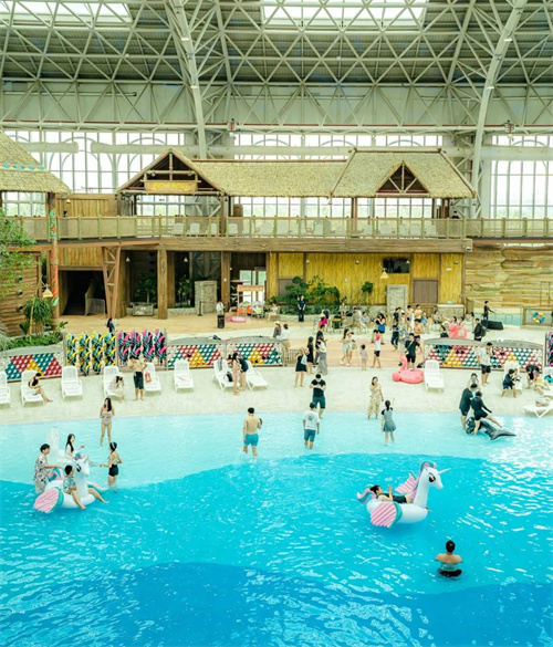 1万平方米的室内恒温水乐园以“水晶宫”为设计亮点,全年开放热带风情滑道、冲浪池、无边泳池等设施,配合可开合自然穹顶设计,实现“冬可冲浪、夏可避暑”的全年运营。