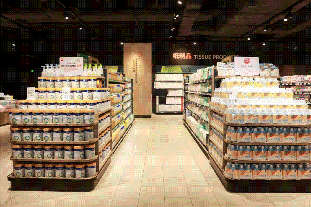 空间场景方面,永辉超市一方面对动线布局进行了优化。传统“强制动线设计”被彻底打破,不仅增加主通道宽度,货架高度也统一降至1.6米,视觉阻隔的消除让消费者视野豁然开朗;另一方面,扩大烘焙、熟食、包点区域面积,现烤面包的香气与蒸汽缭绕的熟食档口交织出浓厚的烟火气。此外,胖东来自有品牌专区+永辉优选品牌专区以开放式陈列打造“品牌岛”,吸引大量年轻消费者驻足选购。