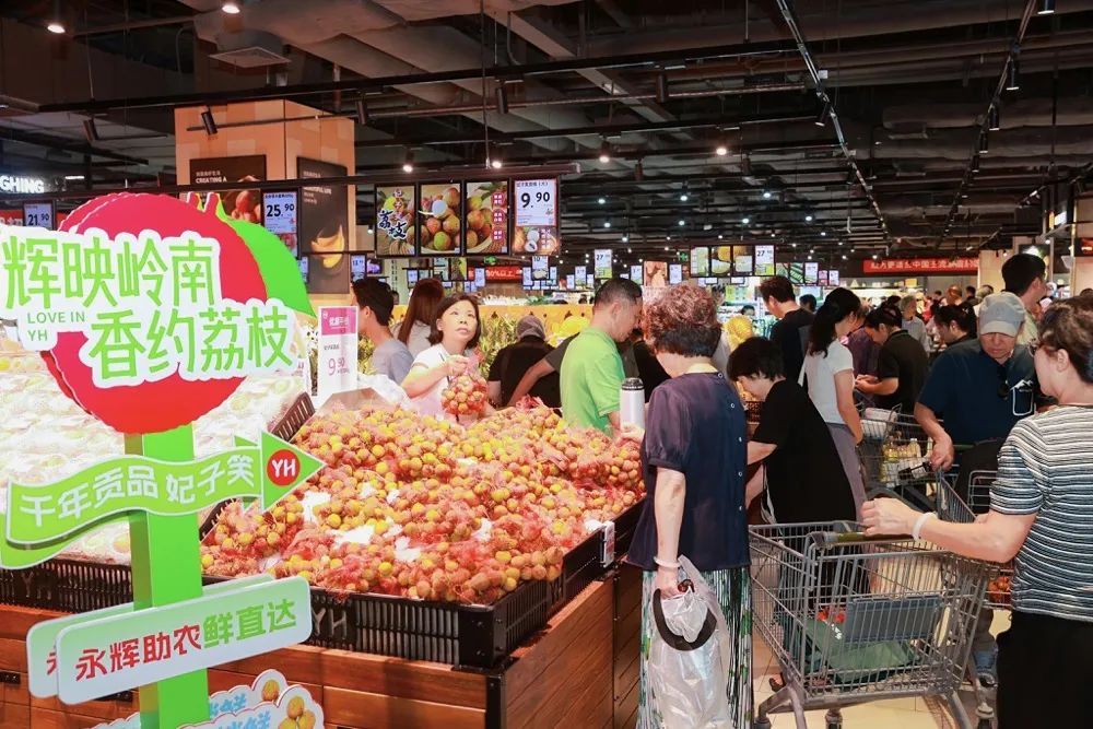 作为“胖改”核心之一,商品结构的调整也是此次升级的亮点。整体来看,汰换后门店单品总数9017支,新引入商品占比达 70%,调整后商品结构接近胖东来商品结构的80%,进口商品占比 13.5%。烘焙熟食区不仅提升了现制现售商品占比,以“前店后厂”模式强化新鲜感知,还推出了手撕鸡、脆皮烧猪、石歧卤鸽等在地特色食品;生鲜区引入龙泉驿水蜜桃、新疆小白杏、潮汕牛肉等十余种“国家地理标识”蔬菜。尤其值得一提的是,该店以产地直采的形式,实现农产品最快24小时到店。开业当天,“千年贡品-广东荔枝”专区更是以新鲜采摘的岭南特产妃子笑荔枝吸引了大量消费者专程前来,从而进一步提升了广州融创茂“文旅+零售”的引力。