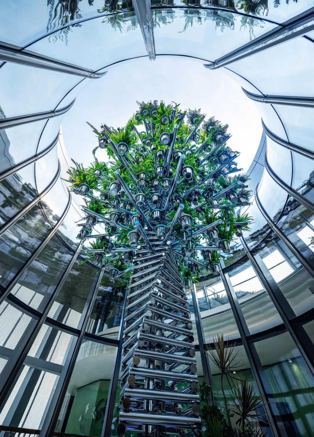 在东翼L3-L5层跃层空间里,高达约8米的「生命之树」屹立于此,以金属框架模拟的树木枝干层层向上,树冠分层嵌入各种绿植并配备自动浇水系统,构成一个奇幻且有生命力的「可呼吸」立体树状生态。当夜幕降临,生命之树枝干上缠绕的540米灯带流转闪烁,营造出自然生态化的多面立体全新空间。