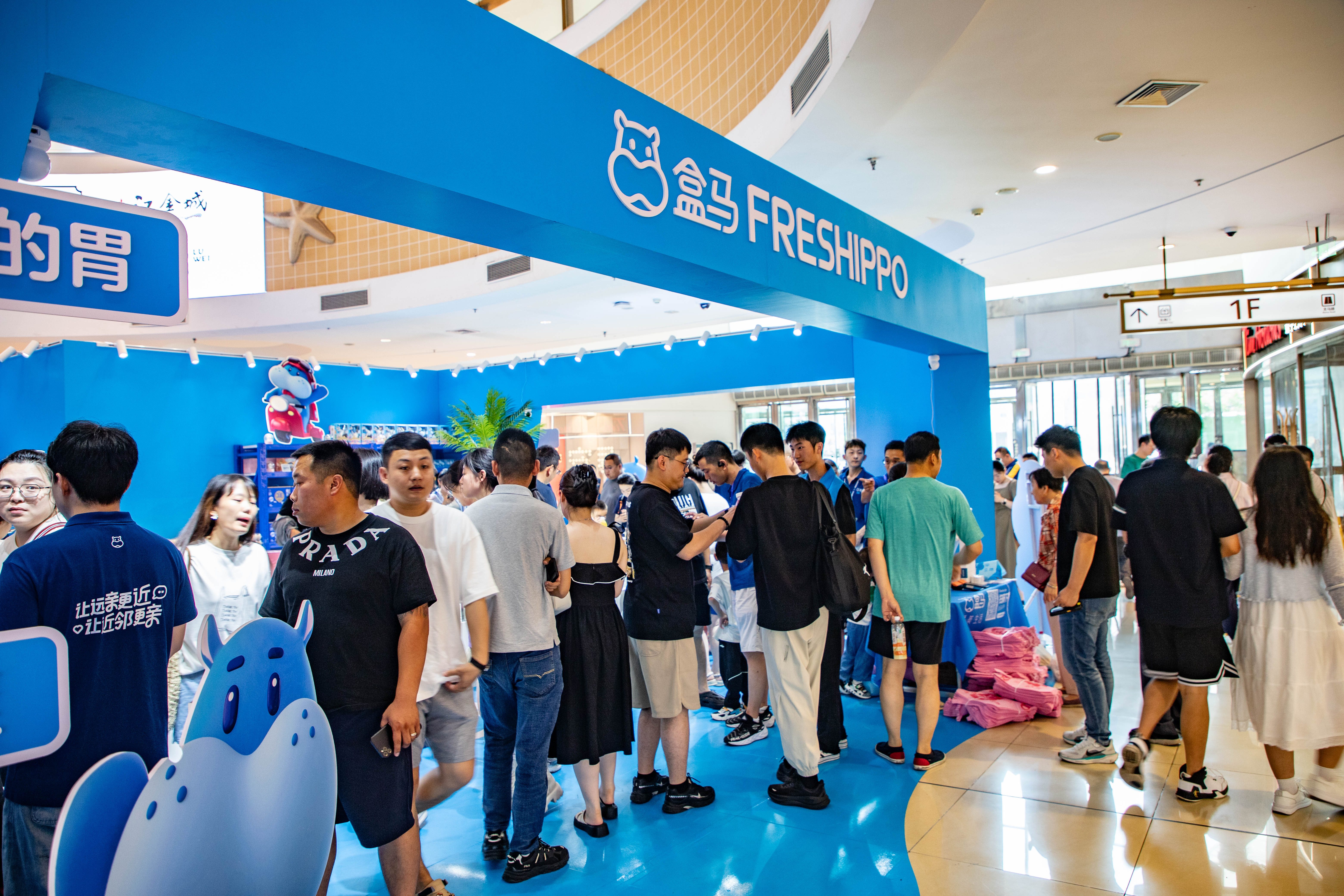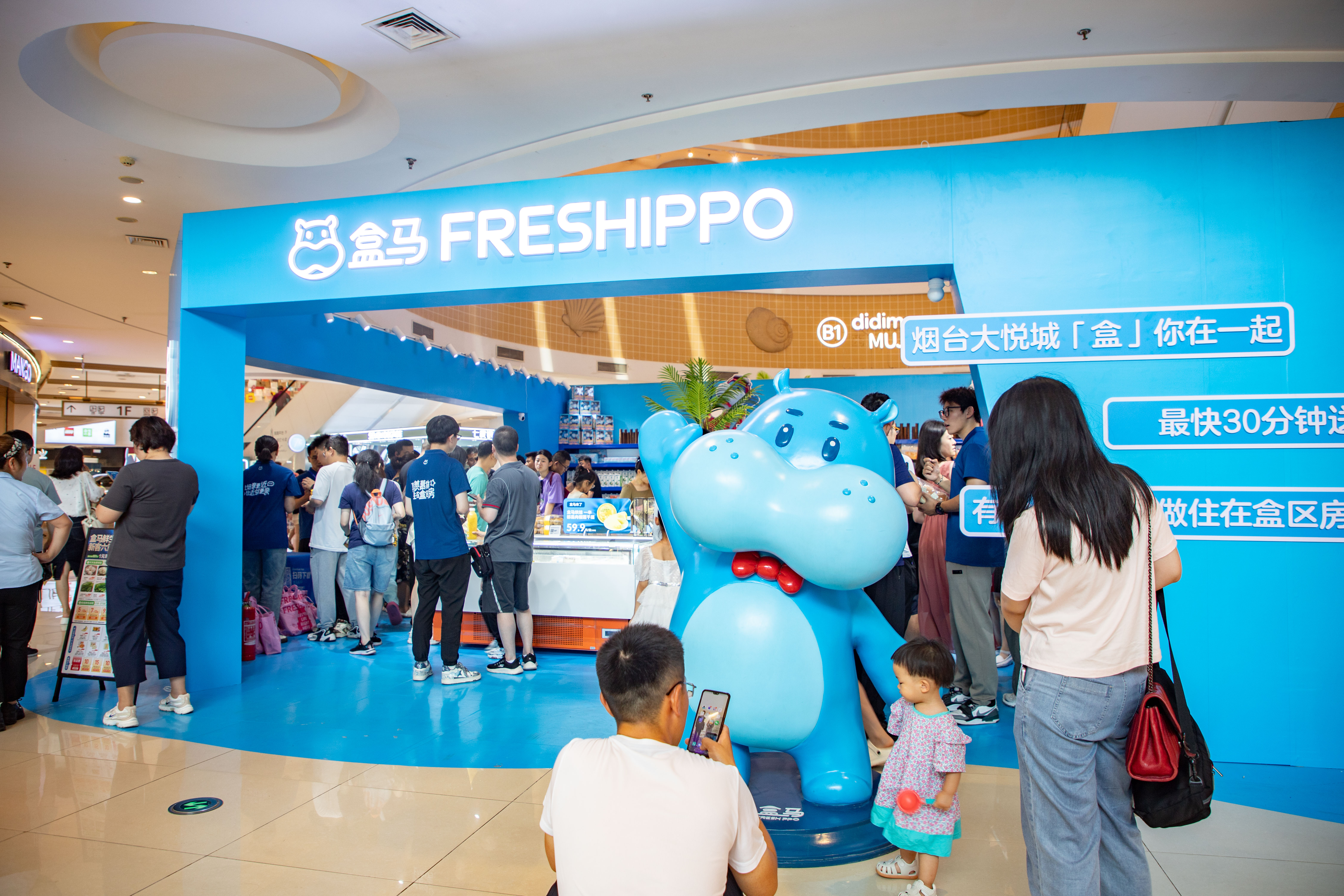 盒马鲜生烟台首店选址烟台大悦城,快闪店以其独具特色的蓝色外观与时尚设计成为商场焦点。