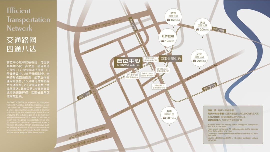 目前,项目周边已开通地铁2号线、17号线,未来将与在建的13号线(预计2026年通车)、规划中的25号线形成“四线交汇”格局,直接覆盖上海主城区及长三角主要城市。