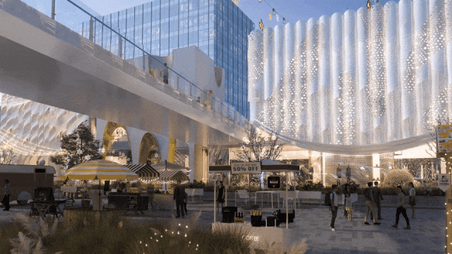 B区・嘉年华的建筑外立面采用镜面不锈钢材质,随光线角度呈现出“火树银花”的视觉效果,随手一拍都是杂志封面。室内则以跳跃色彩与弧形动线打造亲子、萌宠友好空间,引入国际儿童剧目IP剧场与宠物主题咖啡馆,形成家庭客群的 “疗愈聚场”。