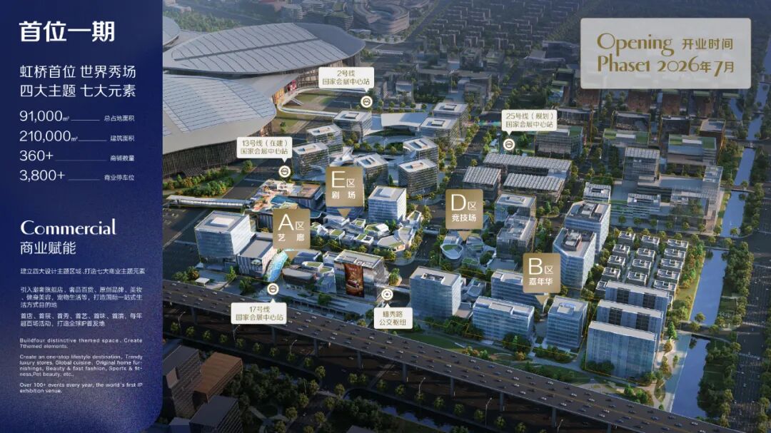 作为上海西片国际级消费集聚区的核心载体,项目雄踞虹桥国际中央商务区正核,与年客流达1200万人次的国家会展中心紧密联动,到虹桥枢纽直线距离不到2 公里,攥着长三角1小时交通圈的流量总开关。“三心合一”的先天禀赋,构成了教科书级流量底盘。