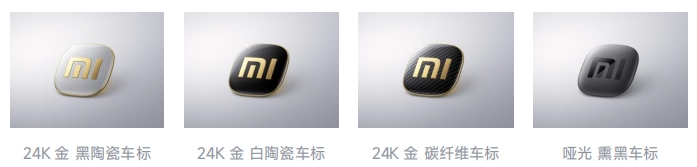 继创新使用碳纤维和 24K 金搭配后,小米汽车再次大胆打破材料边界 ,将温润的陶瓷与黄金相结合,推出更具创新的「陶瓷车标」:24K 金 黑陶瓷车标、24K 金 白陶瓷车标。磁控溅射镀金工艺,镀金更精准, 拥有“金镶玉”般奢华高贵的视觉体验。 陶瓷源于高级腕表与珠宝的制造理念,是超豪华定制车的高端象征, 小米汽车也将陶瓷引入汽车定制,打造出拥有永恒之美与独特触感的奢华部件。除此之外,还有「24K 金 碳纤维车标」和「哑光 熏黑车标」,同样别具一格、尽显运动豪华。