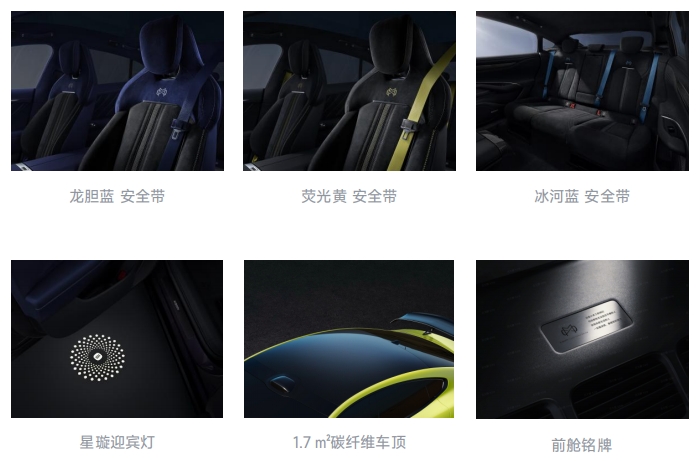 5 款外饰颜色令人夺目,个性非常鲜明。内饰也冲破传统框架 ,颜色不止于黑白灰 ,共推出 4 款内饰色: 龙胆蓝(蓝黑双色)、极夜黑/荧光黄(双色)、极夜黑/冰河蓝(双色)、月影灰(灰黑黄 三色)。色彩 打破常规 ,通过设计师的专业把控,让对比色在内饰中和谐共舞 ,营造出或张扬活力、或优雅复古 、或内 敛深沉 、或豪华尊贵的独特氛围。