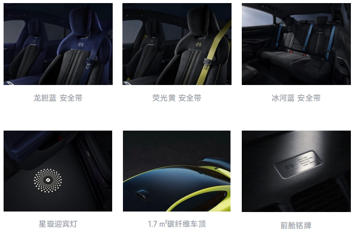 「安全带」同样采用撞色搭配,与内饰同色(龙胆蓝 、荧光黄 、冰河蓝),高亮设计既形成点缀 ,又呼应 整体内饰设计;迎宾灯是高端身份的象征符号,小米定制推出 「星璇迎宾灯」 ,灵感来源于通向未来的「虫洞」,每一次上下车都是满满的仪式感和尊贵感;还有 SU7 Ultra 原型车同源的「经典闪电拉花」 , 不仅有纪念意义 ,同时象征着小米高性能基因,有黄 、蓝 、黑三种颜色可选;SU7 Ultra 专属的豪华「1.7 ㎡碳纤维车顶」是性能玩家必备,更运动更尊贵;前舱机盖打开还有一个藏起来的惊喜专属细节:「前舱 铭牌」,与量产车镌刻电机功率不同,定制铭牌镌刻的文字是小米汽车送给专属人群的一封低调情书。