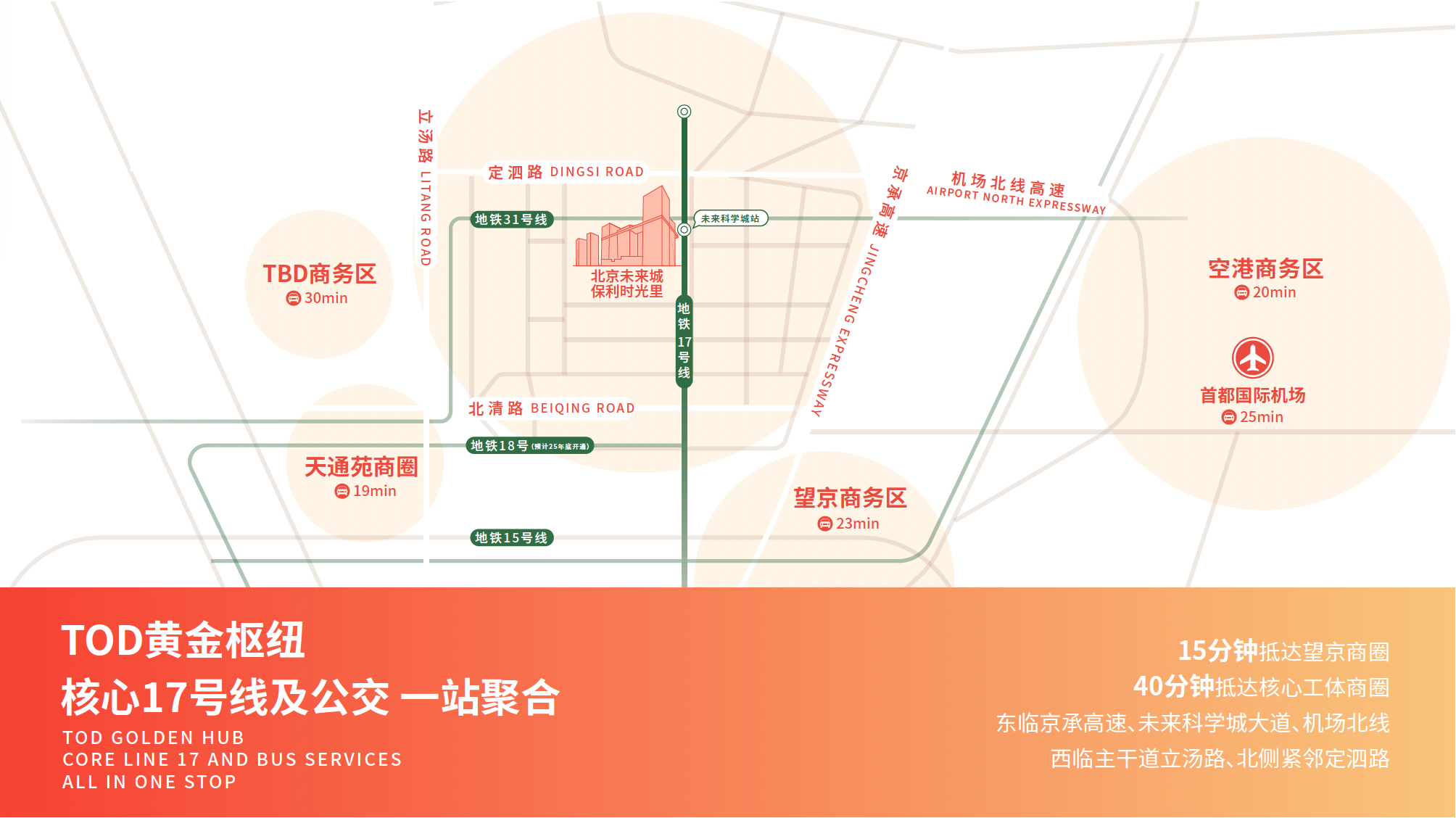 作为保利发展控股在京北的“旗舰”项目,保利未来大都汇以“轨道+生态+产业”融合发展为理念,坐拥地铁17号线TOD黄金枢纽,约15分钟直达望京,40分钟衔接工体,无缝接驳城市核心区。