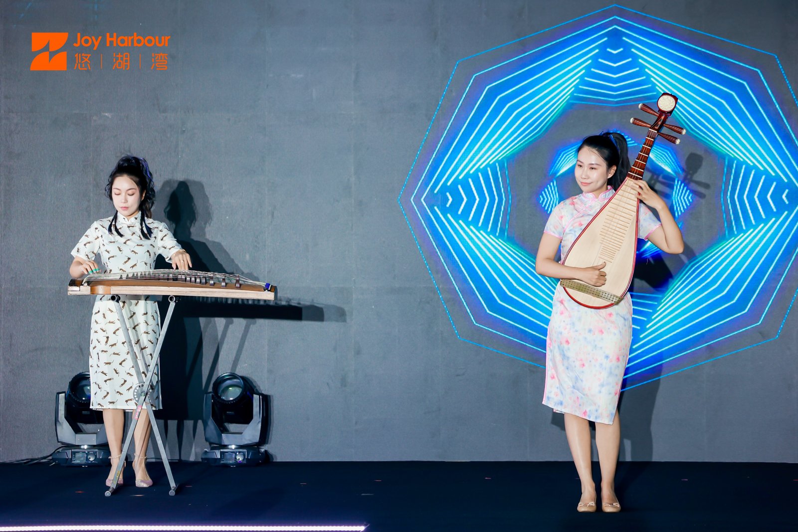 活动伊始,一场别开生面的开场表演便惊艳全场。DJ与古筝、琵琶的奇妙组合,在悠湖畔奏响创新融合的乐章。伴手礼的黑胶唱片也暗藏巧思——提前采集了上秦淮生态湿地的自然之声,融合录入唱片,用声波勾勒出悠湖湾项目"好玩"的核心特质。现场还通过直播与线上线下观众实时互动,让更多人见证这场充满温度的商业盛会。从音乐到自然,从科技到人文,每一个细节都在诠释着悠湖湾想要表达的商业理念——在传承中创新,在融合中突破。