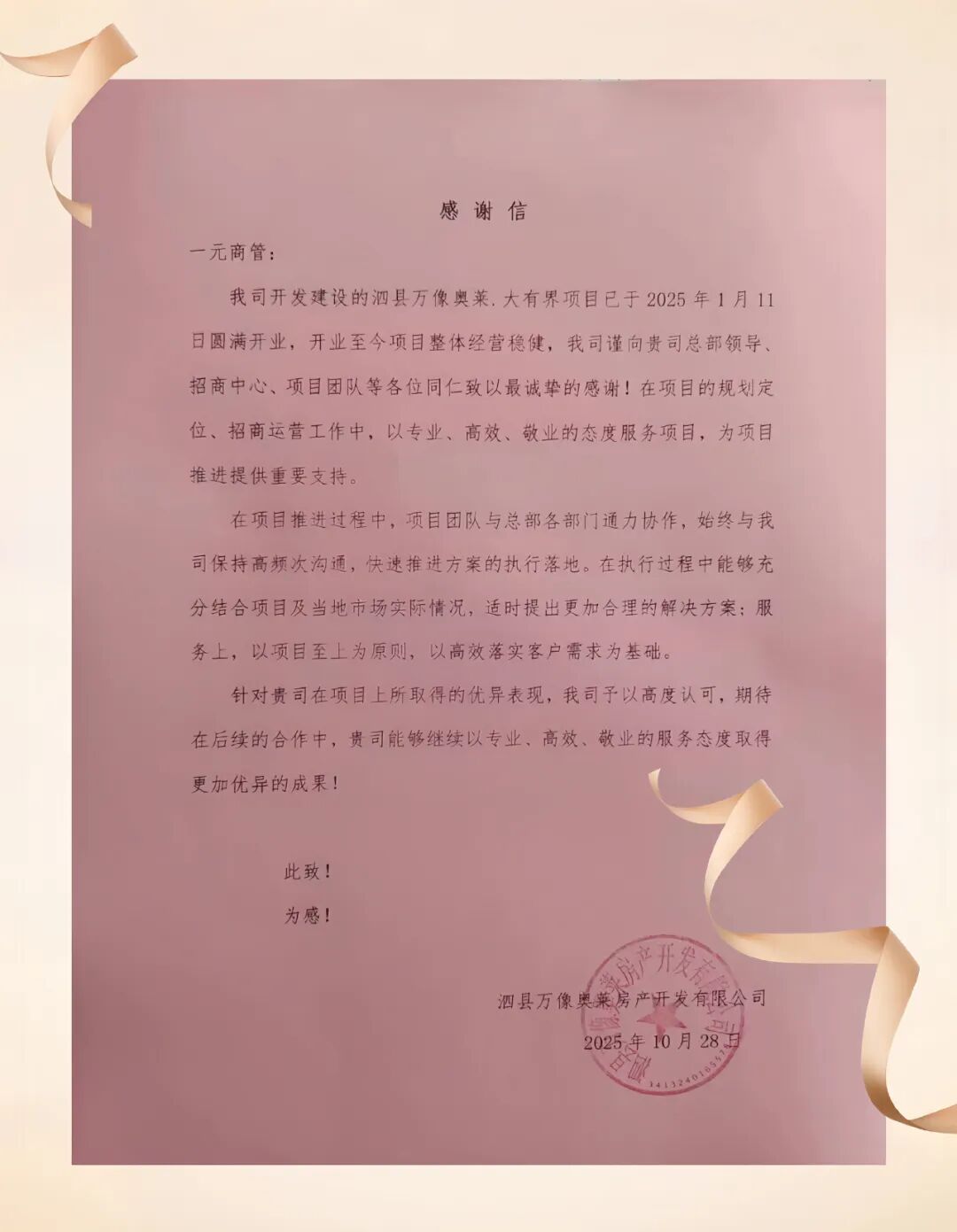 近日,一元股份亦收到泗县项目业主方发来的感谢信。信中,业主方对一元股份助力项目圆满开业、及开业后稳健运营所付出的努力致以诚挚谢意,并高度认可一元股份在项目全流程管理中展现的“专业、高效、敬业” 服务品质。正是凭借这种专业能力赋能与双方的默契协作,为此次合作的成功奠定了坚实基础。