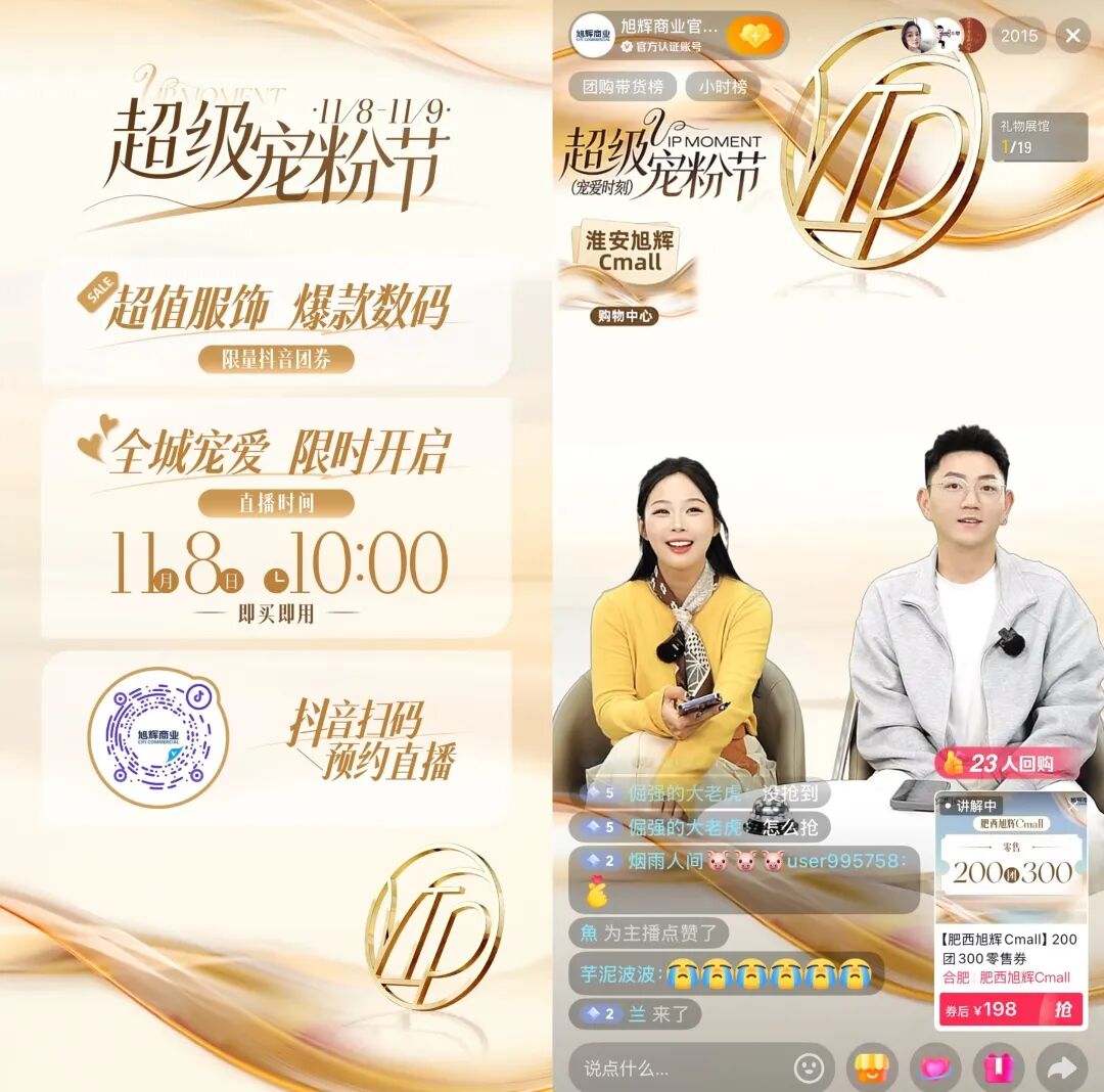 同时,旭辉商业还创新性地通过抖音直播,构建流量互通、消费协同的生态,借此实现销售的高效转化。今年超级宠粉节期间,南昌、合肥、成都温江、成都新都、淮安等多个旭辉Cmall共同在抖音平台开展直播售券活动,构建了“内容引流-线上交易-线下核销-会员沉淀”的闭环。活动期间,参与项目总GMV突破100万元,总曝光量达216万,直播观看量突破5万人,话题互动量超3万次。