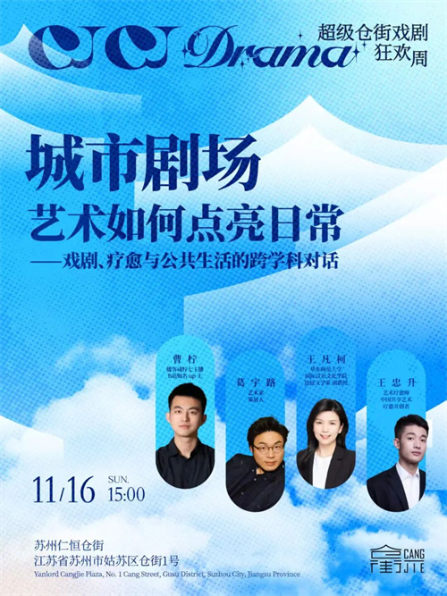 此次戏剧狂欢周是在江南故事中,以想象构筑起的平行世界。在平江路与耦园倾听姑苏城往昔华彩,追随艺术指引,在仁恒仓街找寻姑苏新章。万物「仓」生,让未经历之事,未出发的脚步,未体验之物,因戏剧的存在而在仓街发生。