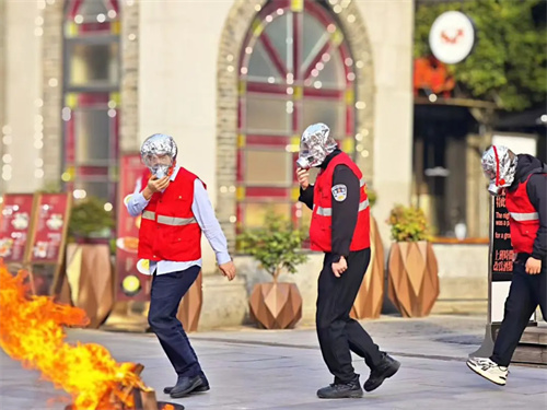 商户联动紧密有序: 各商户员工在管理人员的指挥下,用湿毛巾捂住口鼻,低姿弯腰,沿着最近的安全疏散通道,快速、有序地撤离至指定安全集合点。整个过程忙而不乱,充分体现了日常安全训练的成果。
