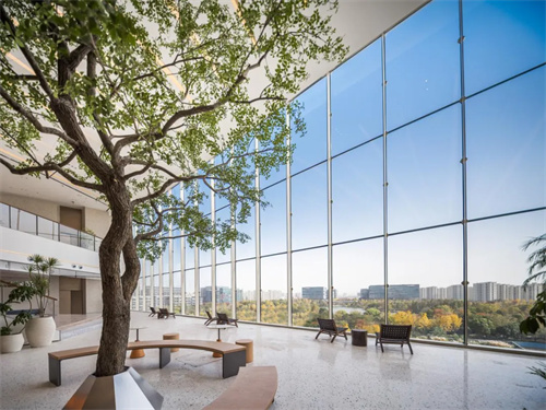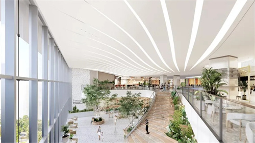 上城天街紧邻丰收湖公园,通过“置身风景之中”的设计理念实现商业空间与自然景观的深度融合。项目五至六层的“丰收湖之眼”采用10米挑高跨层空间与全景玻璃幕墙设计,将自然湖景引入室内,形成与自然对话的“城市之窗”;一层“茶话巷”则首创室内外无间断市集空间,集结50余个品牌打造“湖畔漫游”场景。