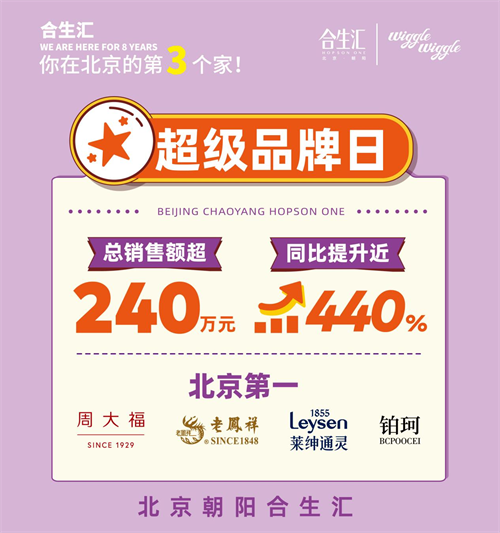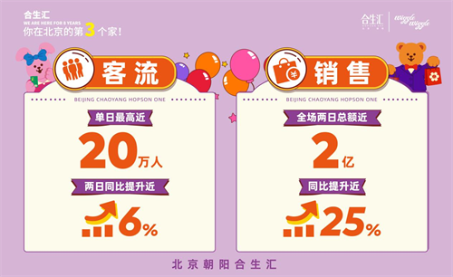 北京朝阳合生汇8周年,两日销售额近2亿元,同比提升近25%;单日峰值近20万,创开业以来同期新高,两日同比提升近6%。在商业存量竞争日益激烈的市场格局中,合生汇仍保持双位数增长,展现出强大的运营韧性与消费吸引力。基于周年庆期间客流与销售双引擎的强劲表现,北京朝阳合生汇全年销售额预计将突破85亿元,进一步巩固其作为城市商业标杆的领先地位与持续成长动能。