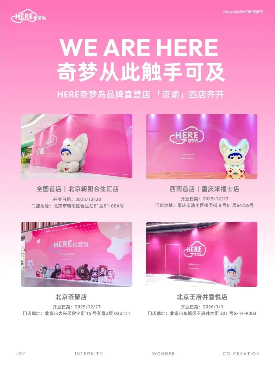 中国原创潮玩品牌HERE奇梦岛(以下简称奇梦岛)近期加速线下布局,宣布于2025年12月下旬至2026年1月初,在北京、重庆两地开设4家品牌直营店。