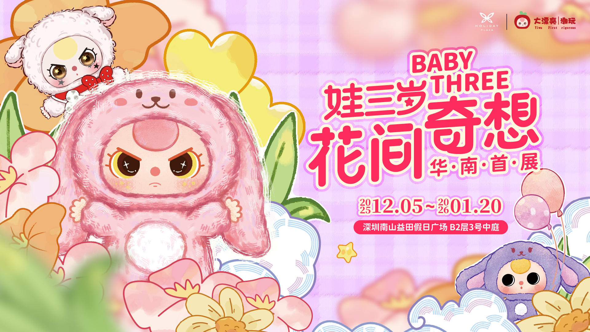来自“潮玩制造梦工厂”东莞的首创“会变脸”情绪盲盒IP——娃三岁,首次登陆华南地区,以“花间奇想”为主题,将商业空间转化为可进入的梦境。娃三岁的诞生集中体现了创意设计与精密制造能力,每一只都是独一无二的“小情绪收藏品”。现场设有娃三岁超大气模打卡点,粉丝可免费合影。展览横向串联外广场、L1主入口、B2地铁口至核心中庭,纵向利用玻璃幕墙、包柱等空间,编织出密集的打卡网络,场景全面升级,构筑全景式梦幻景象。