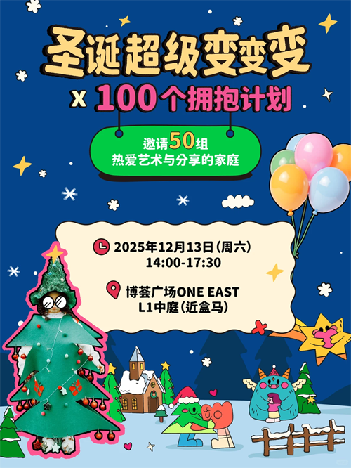 博荟广场ONE EAST携手上海市青少年校外活动平台,共同发起「圣诞超级变变变× 100个拥抱」活动,孩子们将穿上自己亲手DIY的圣诞树服装给路人送上“爱的抱抱”,以充满童真的拥抱传递勇敢面对困难的力量,在孩子心中播撒“爱与善意”的种子,用纯粹的正能量温暖整个冬日!