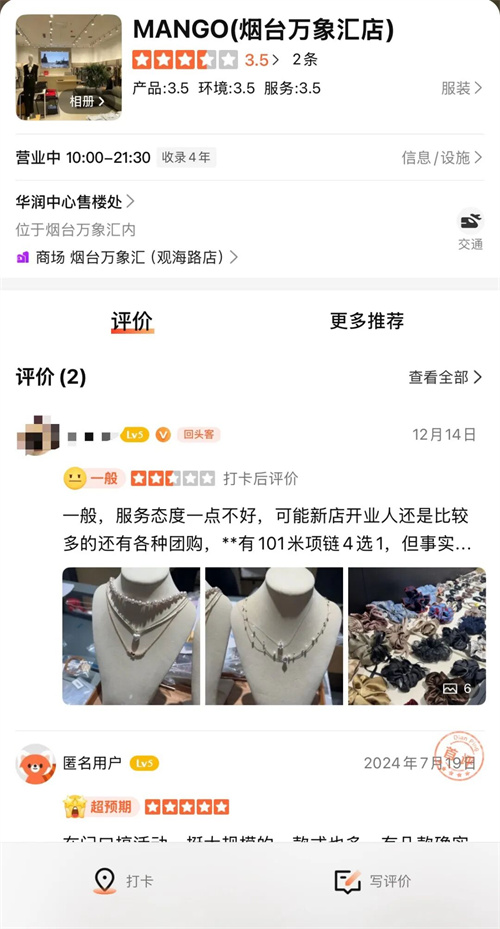 值得一提的是,大众点评显示,MANGO目前在烟台万象汇已有一家门店,被收录4年,该门店首评发布在2014年,最新评论在2025年12月14日。