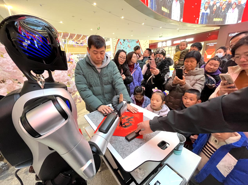 龙玥城巧妙地将现代科技与传统书法融合,为消费者传递周年庆的双重祝福。机器人化身“领队”携两台活泼机器狗开启商场巡游,机械狗翻滚互动;A2机器人则挥毫写“福”,科技与传统文化在龙玥城碰撞出意想不到的温情场景。