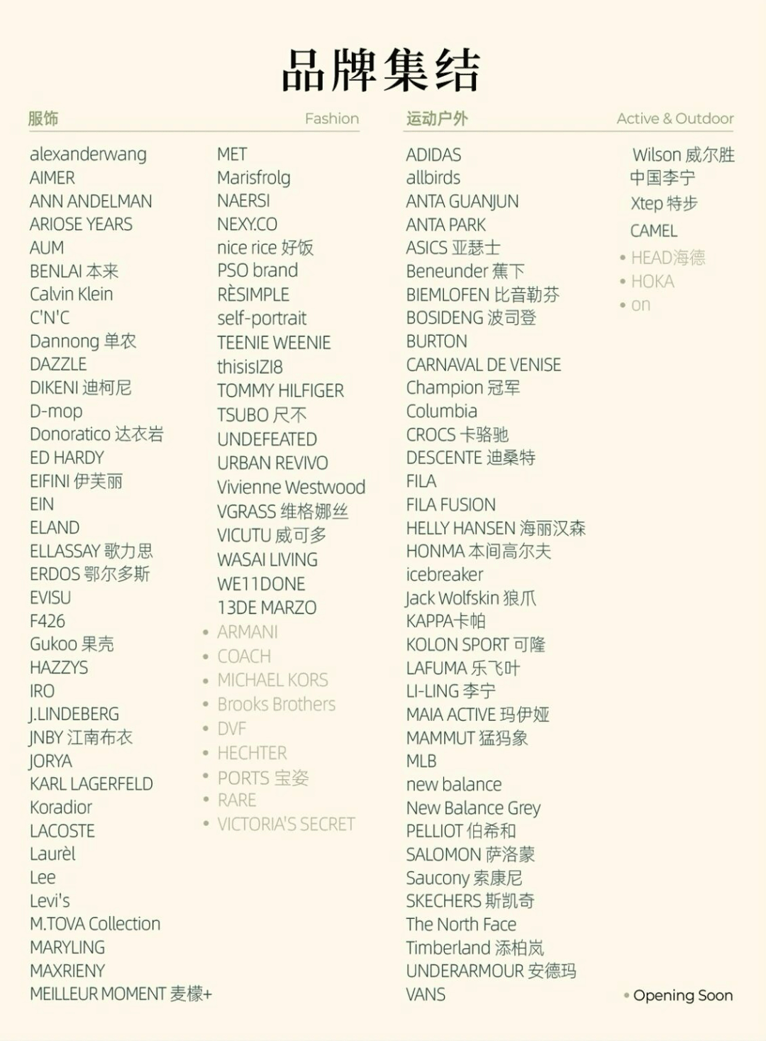 从摩登秀场到日常衣橱,这里汇集了当下触手可及的风格选择,也蕴藏着关于美学的持续惊喜。你不仅能在这里找到独具态度的设计师品牌如alexanderwang、Vivienne Westwood,体验即刻的前沿风尚;更值得期待的是,在不远的将来,Brunello Cucinelli、Armani、COACH、Michael Kors等更多重磅品牌将陆续呈现。它们将共同构筑一个层次更丰富、选择更多元的完整时尚目的地,让每一次探索都充满新的可能。