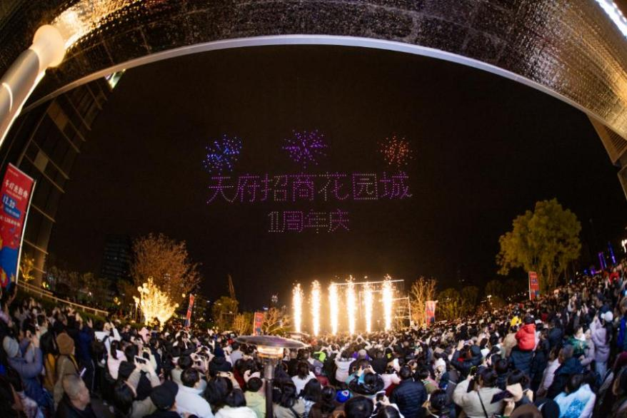活动期间,千架无人机带来的光影秀和非遗打铁花、北欧极光秀同夜精彩上演,成功打造了震撼的视觉盛宴。表演在星光与灯光的交错中点亮了天府新区的夜空,向到场观众展示了天府招商花园城作为创新文化消费目的地的独特魅力。