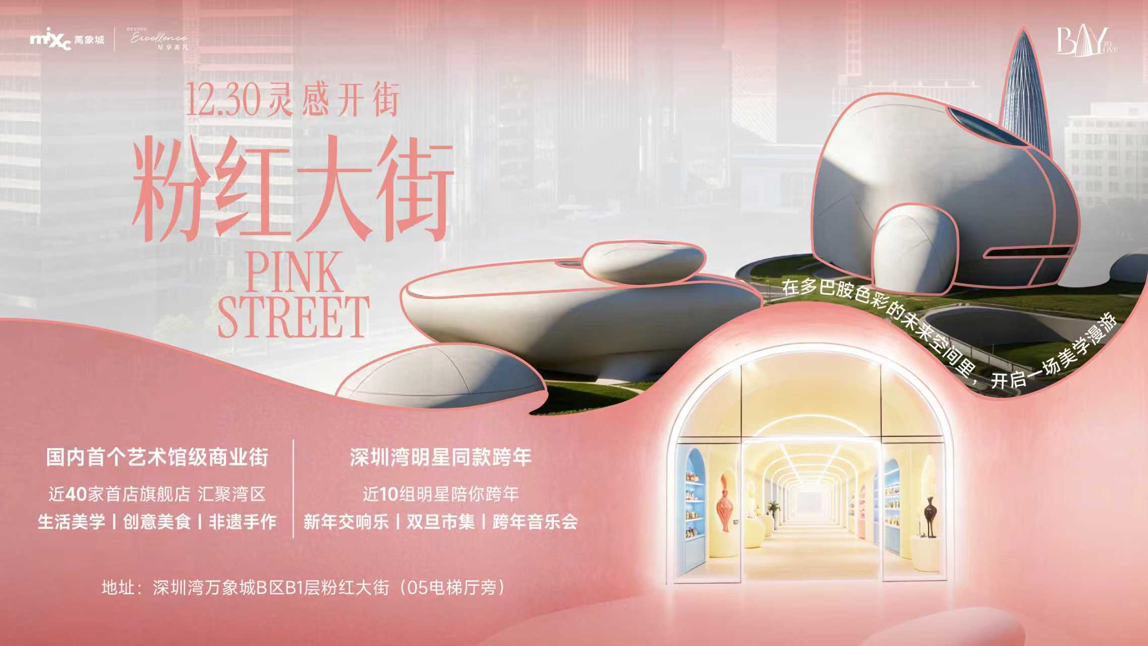 深圳湾万象城PINK STREET粉红大街,位于B区B1层,是深圳湾文化广场的重要商业配套与活力延伸。作为国内首个艺术馆级商业主题街区,它以“多巴胺美学”为设计语言,将未来感色彩融入建筑与场景,构建出一个兼具艺术纯净感与商业感染力的沉浸式空间。