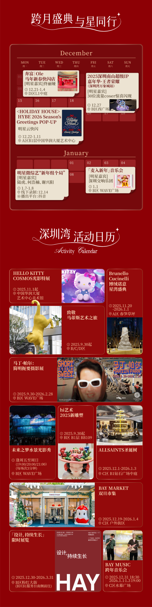 粉红大街开街之际,深圳湾万象城同步启幕深圳湾明星跨年月,带来20+场跨年元旦主题活动、近10组明星同款跨年体验。从2025年12月到2026年1月,BAY MARKET双旦市集、BAY MUSIC跨年音乐会等限定活动轮番上演,为湾区消费者献上一场丰富热闹的新年盛宴。