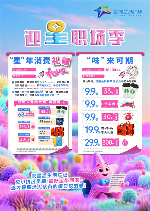 用好生活与工作的换乘站资源,在节日期间以“迎星职场季”为主题策划专属“打工人”的假期活动,节日期间不仅线下有星年消费礼赠幸运抽奖,线上更有超值9块9咖啡续命抢购、29块9服饰焕新礼券、66团100聚餐消费券等超值优惠。