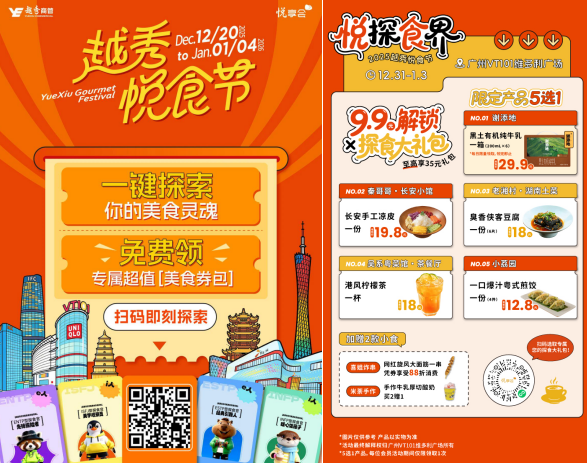 2025年12月20日,越秀商管在延续往期多次活动成功经验、沉淀百万级会员基础的前提下,正式启幕以“悦探食界”为主题的越秀商管悦食节。本届悦食节以“美食为核、多业联动、文化赋能”为理念,创新打造“美食+”多元消费融合场景,于12月20日至2026年1月4日陆续落地广州、佛山、武汉、西安等城市核心商圈,覆盖越秀商管旗下近20座商业体,为各地市民呈上一场集美食品鉴、潮流社交、文化体验、购物狂欢于一体的沉浸式跨年狂欢盛宴,持续点燃冬日消费热情。
