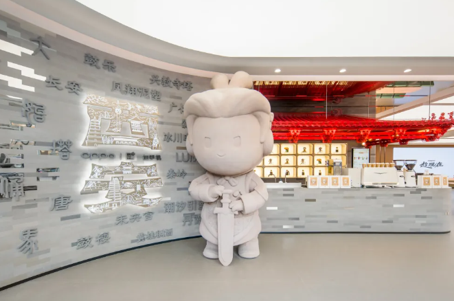 不仅是一家门店,西安旗舰店也致力于打造一座没有围墙的文化驿站和社交空间,除了呈现古代长安的历史文化,门店也将年轻人喜欢的二次元文化融入空间设计。